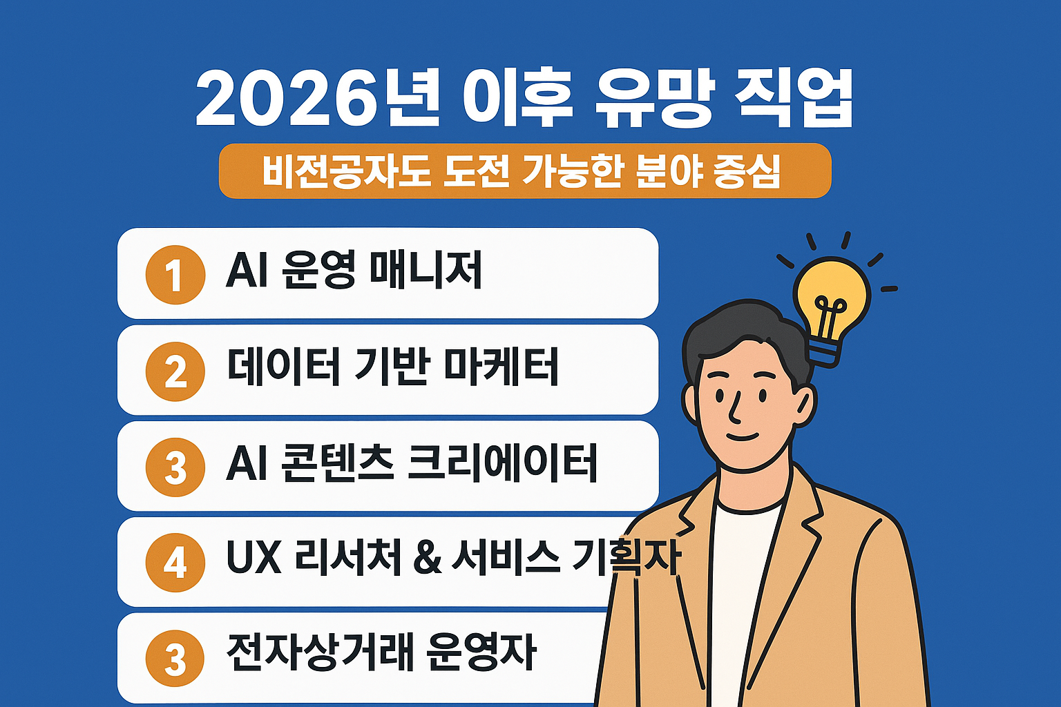 특히 전공에 막혀 도전할 수 없다고 느끼는 분들을 위해, 비전공자에게도 진입 장벽이 낮고 성장성이 높은 분야만 선별해 정리해보았습니다.